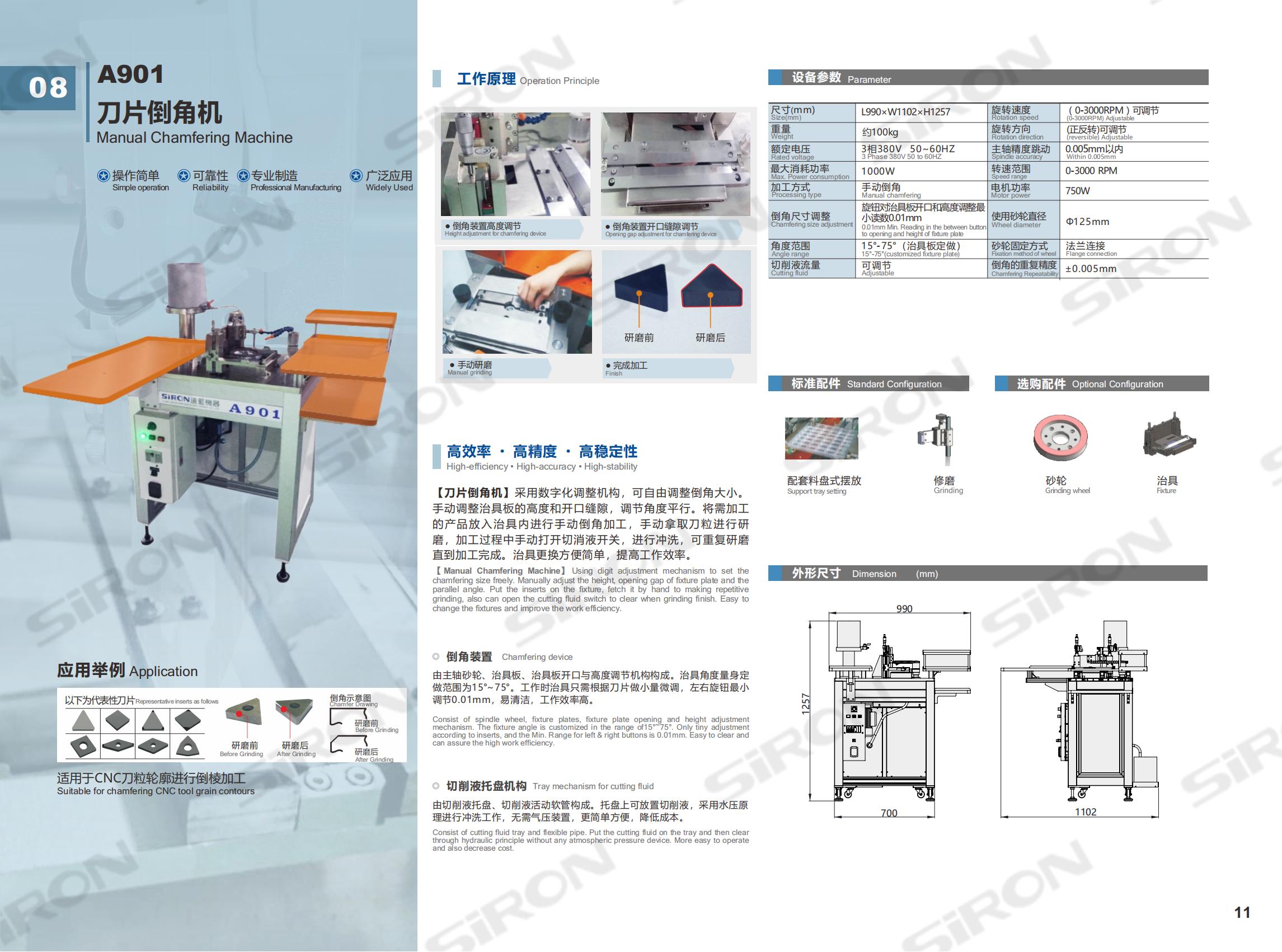 【刀片倒角机】采用数字化调整机构,可自由调整倒角大小。手动调整治具板的高度和开口缝隙,调节角度平行。将需加工的产品放入治具内进行手动倒角加工,手动拿取刀粒进行研磨,加工过程中手动打开切消液开关,进行冲洗,可重复研磨直到加工完成。治具更换方便简单,提高工作效率。